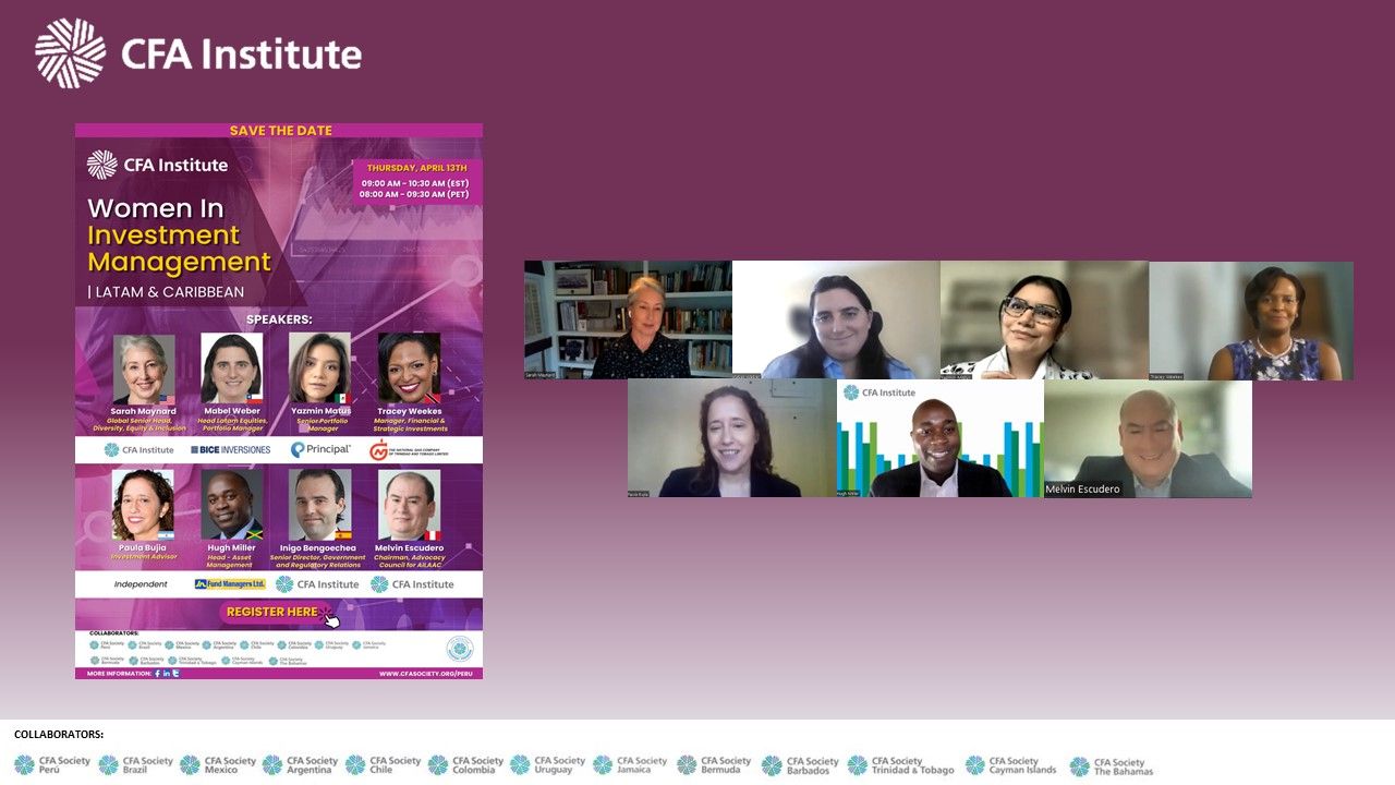 El día jueves 13 de abril, el Consejo de Advocacy para la Región América Latina y el Caribe de CFA Institute (AILAAC, por sus siglas en inglés) organizó la Conferencia Virtual denominada "Women In Investment Management | Latam & Caribbean", que tuvo lugar desde las 08:00 am hasta las 09:30 am (PET) a través de la plataforma Zoom Webinars.