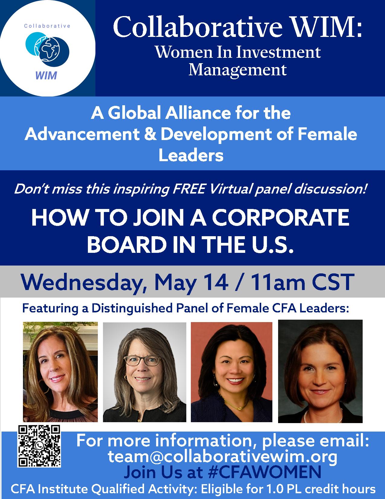 Join WIM (Women in Investment Management) for this Virtual Panel Discussion to discuss “How to Join a Corporate Board in the U.S.” This collaborative event is hosted by the CFA Society Stamford.