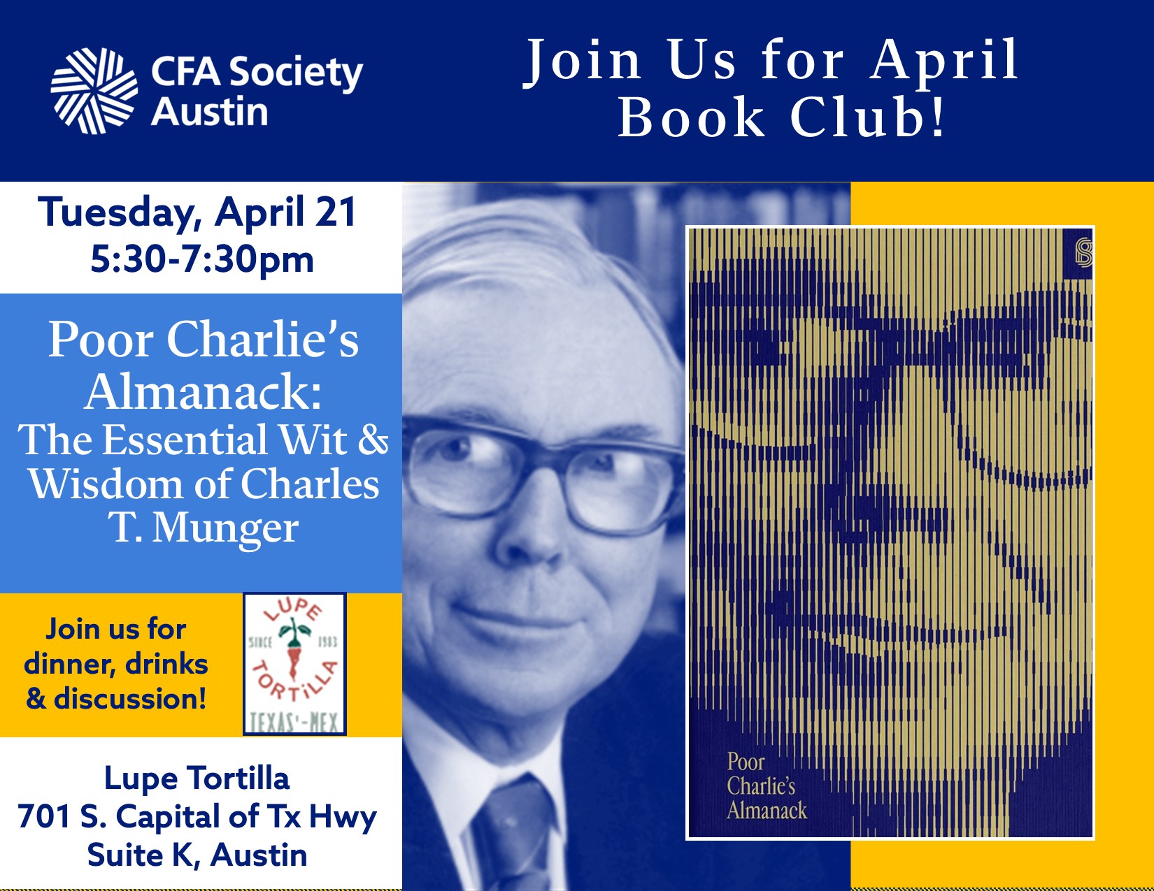 Join your fellow society members to discuss legendary Berkshire Hathaway vice-chairman's book, Poor Charlie’s Almanack: The Essential Wit and Wisdom of Charles T. Munger.