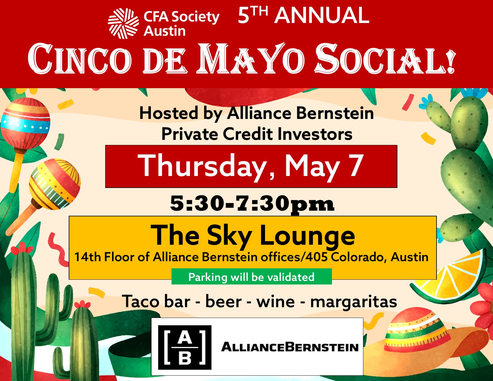 Join us for the 5th Annual Cinco de Mayo social, sponsored by AllianceBernstein Private Credit Investors! Food and beverages provided, 5:30-7:30pm, at the SkyLounge on the 14th floor of the AllianceBernstein offices at 605 Colorado St., Austin, TX 78701. Parking will be validated and is in the building on the Colorado Street side. When you park and enter the elevator, press Sky Lounge and it will take you directly to the event.