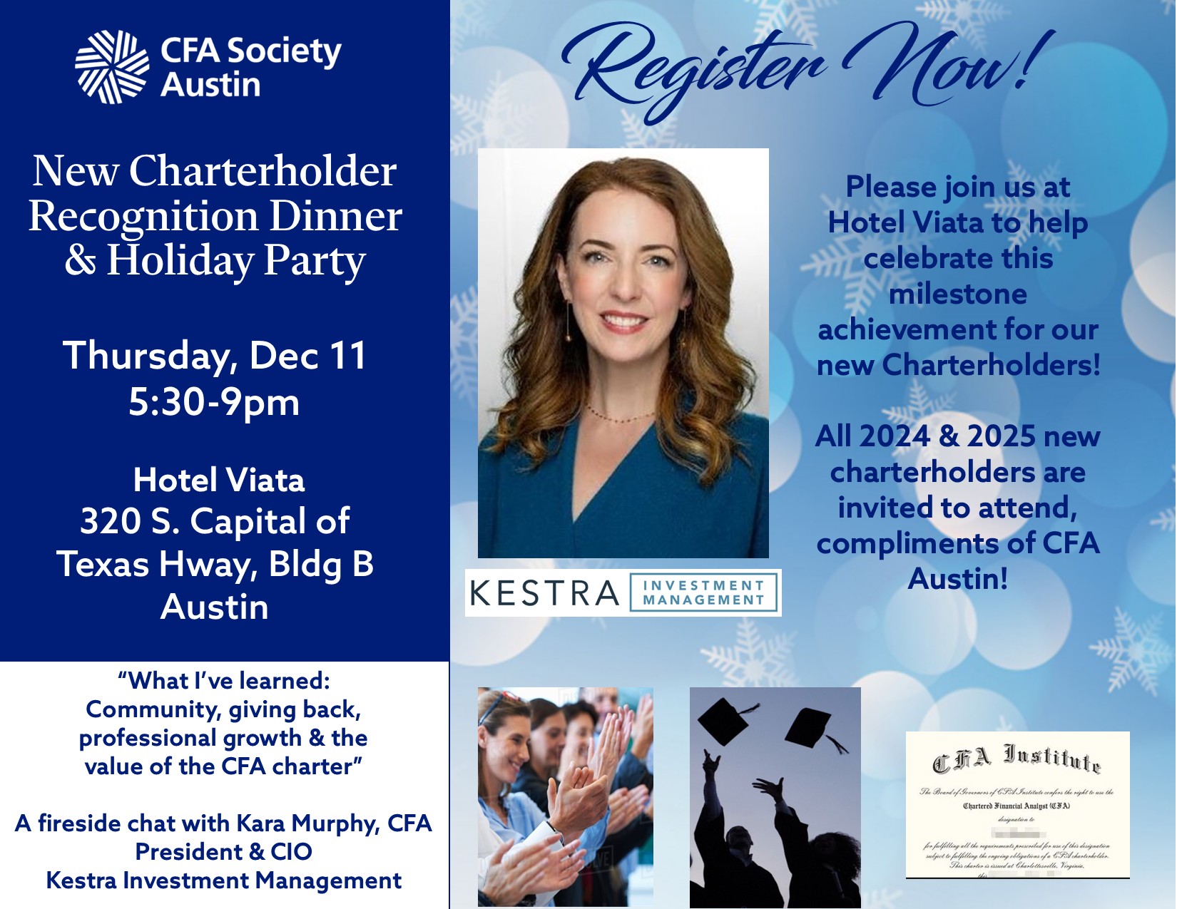 Let’s get a big CFA Austin member turnout to applaud this milestone achievement! This special holiday event will include a presentation of “What I’ve learned: community, giving back, professional growth and the value of the CFA charter” by Keynote Speaker Kara Murphy, CFA - President and CIO of Kestra Investment Management. All 2025 new charterholders are invited to attend with a guest compliments of CFA Austin!