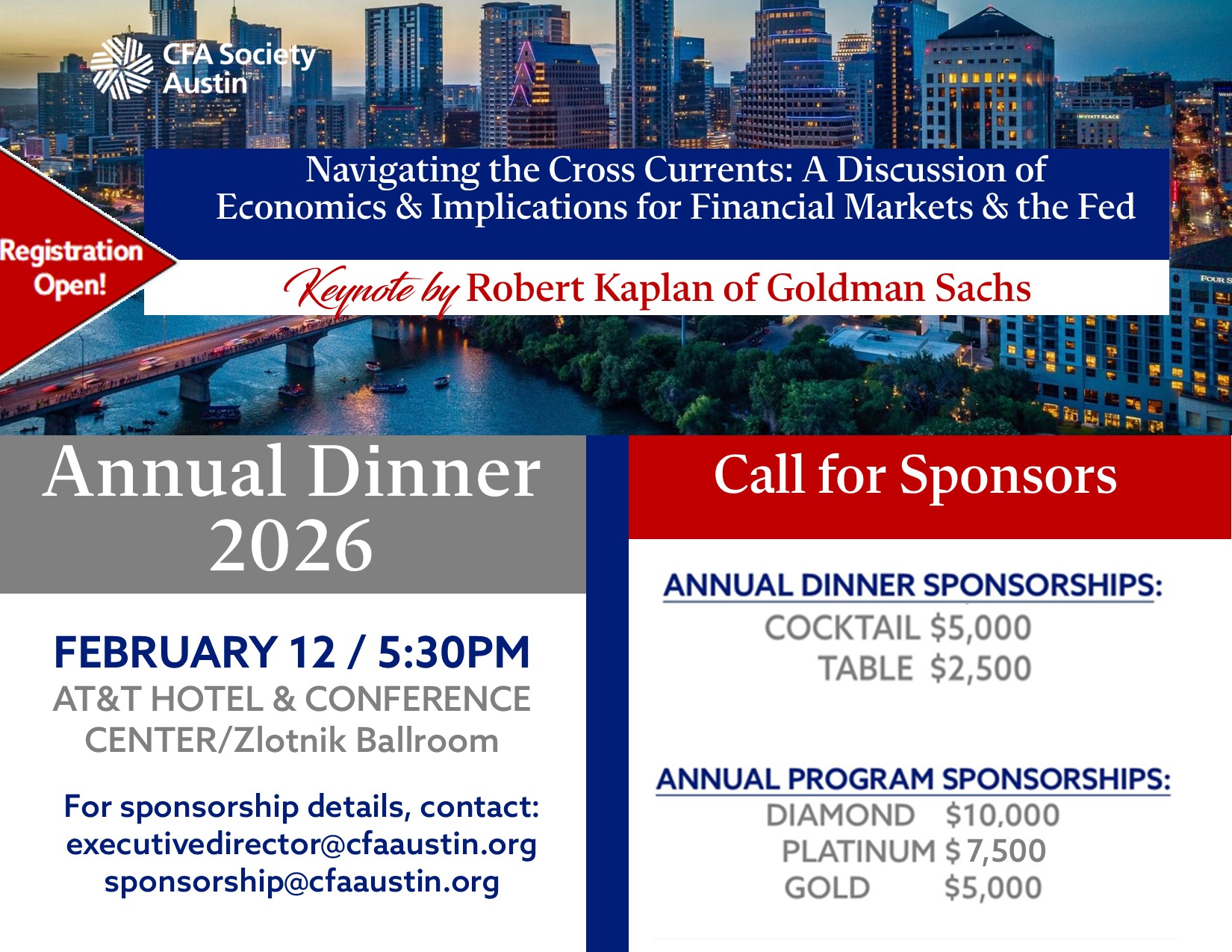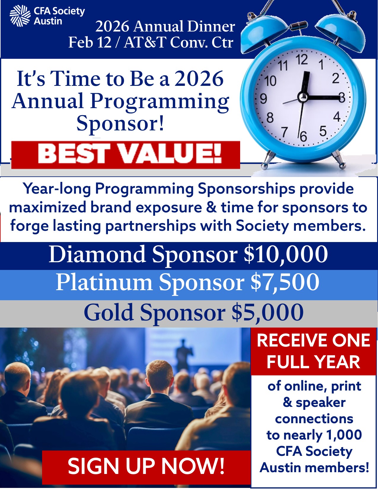 View the CFA Society Austin - 2025-26 Sponsorship BrochurePlease contact the sponsorship chair with any questions or requests for information at [email protected]