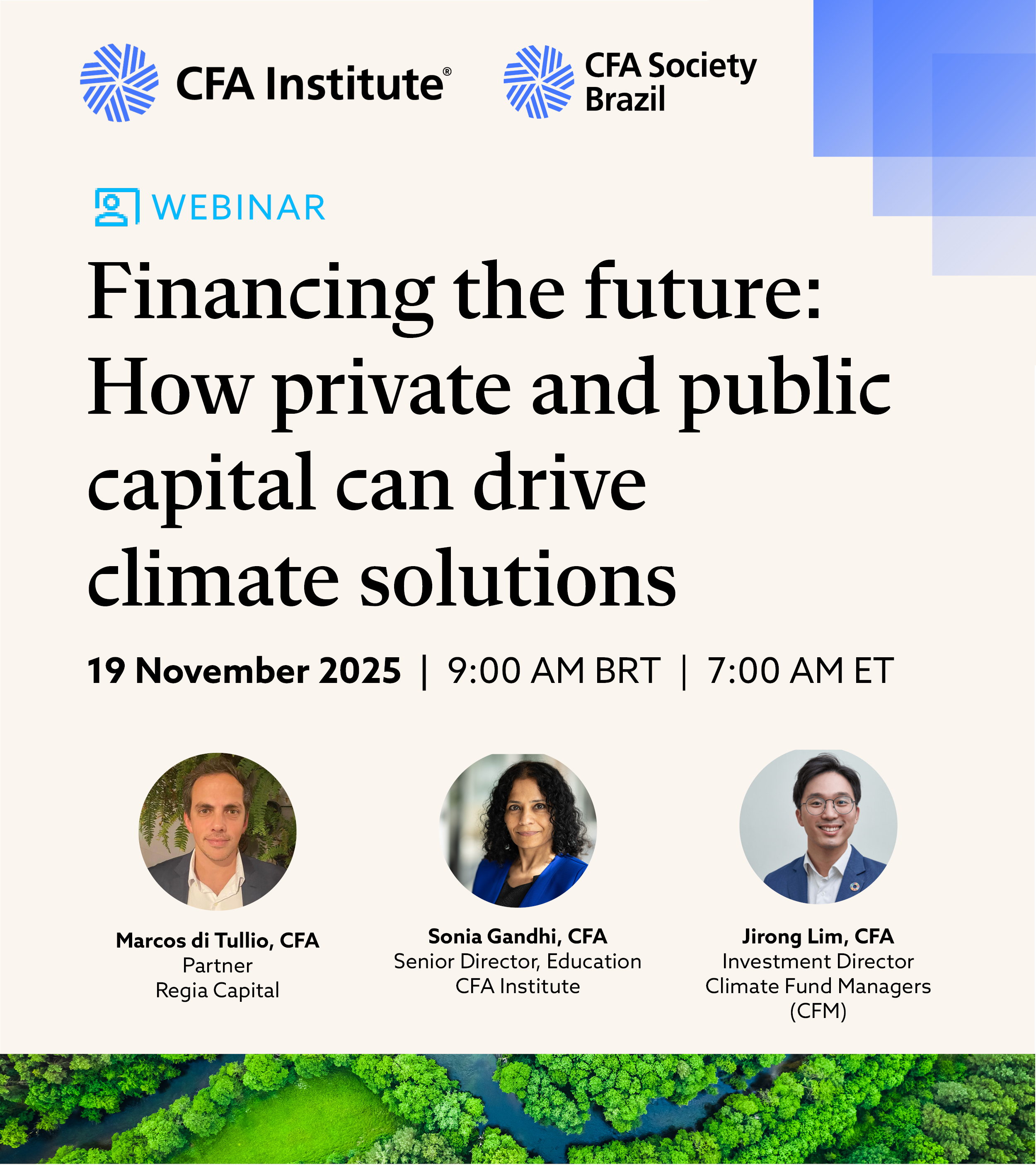 Join senior leaders from across private and public finance for Financing the Future: How Private and Public Capital Can Drive Climate Solutions — a CFA Institute webinar exploring how markets can turn post-COP30 momentum into measurable impact.