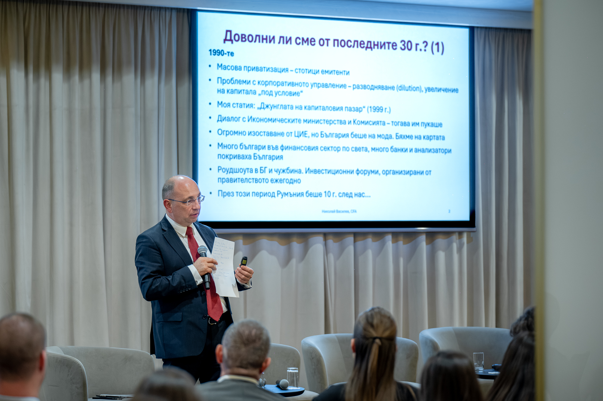 The closing presentation, focusing on “What Is Bulgaria Still Lacking to Become a Leader in the Capital Markets?”, was delivered by Nikolay Vassilev, CFA, Chairman of the Board of Directors of the Bulgarian CFA Association. Vassilev traced the thirty-year trajectory of Bulgaria’s capital market – from its “golden age,” marked by record SOFIX growth, to the subsequent stagnation that ultimately led to the country’s removal from the list of frontier markets. He argued that the underlying issues are systemic: the absence of a clear vision and coherent state strategy, a limited number of listings, chronically low liquidity, and a regulator that lacks sufficient professional capacity. Vassilev outlined concrete measures to reverse this trend, including the privatization of the stock exchange and the central depository, state-led listings, and a large-scale public awareness campaign promoting more than 100 Bulgarian companies – steps that, in his view, could restore Bulgaria’s presence on the regional investment map.