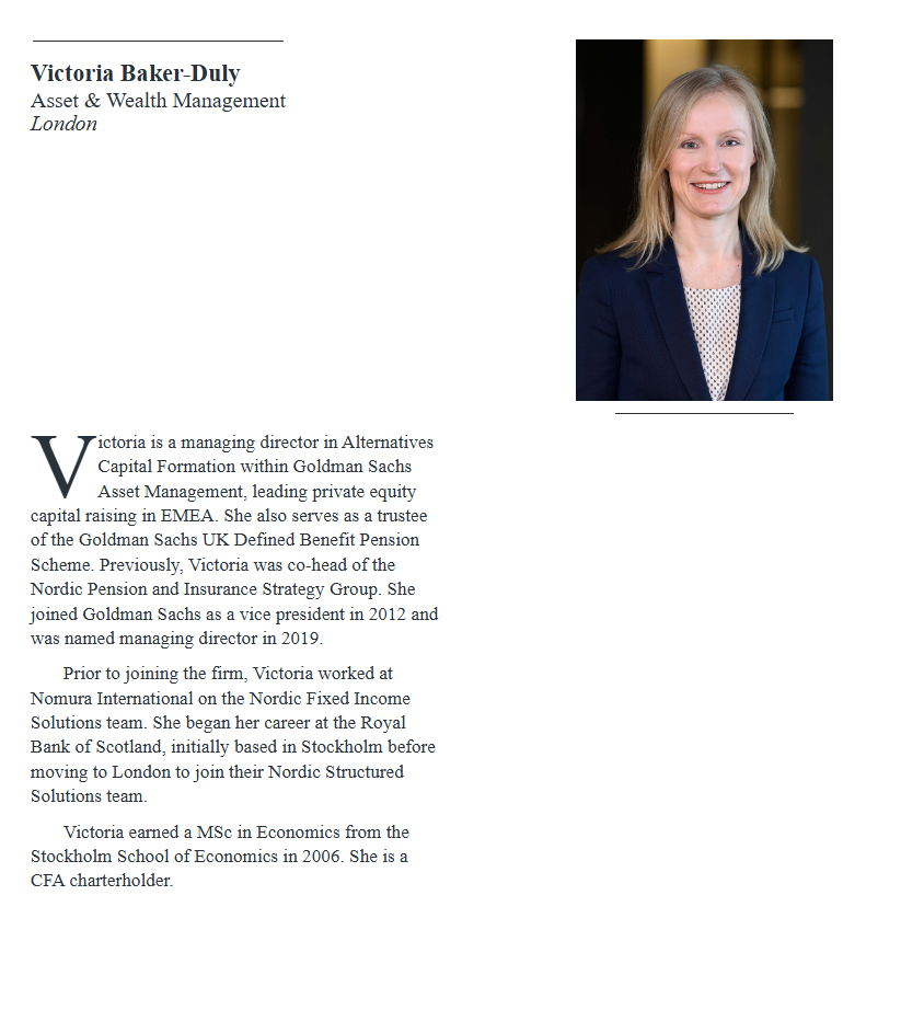 This year´s New Chartholder Award ceremony takes place at beautiful W Prague, 28.11.2024. We are very pleased to announce the special guest - Mrs. Victoria Baker-Duly, Managing Director, Goldman Sachs Asset Management.