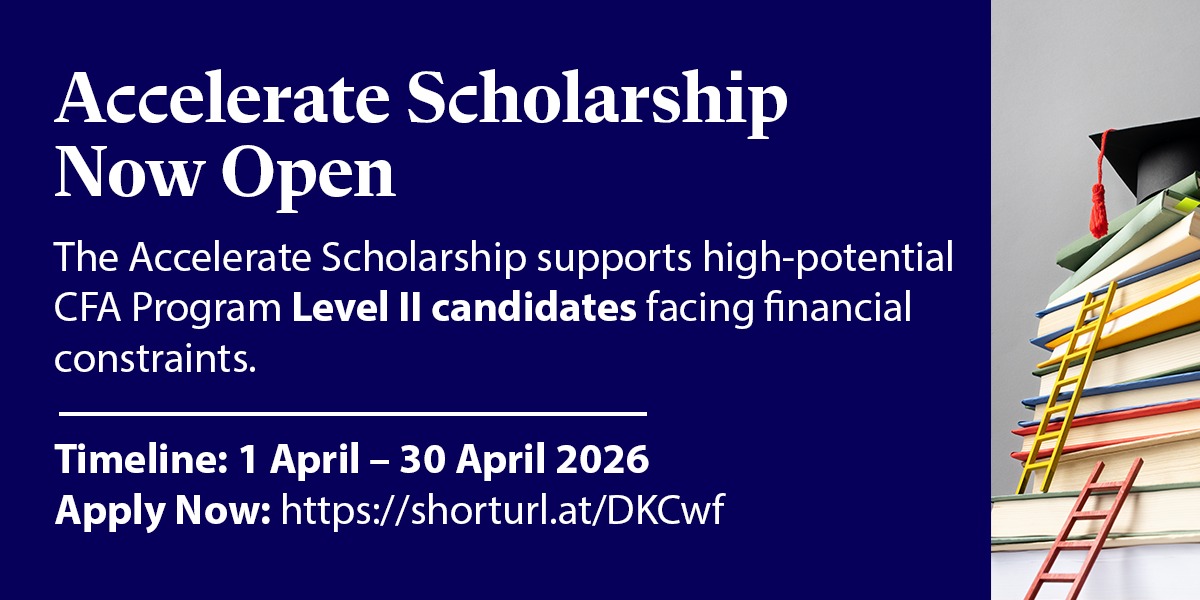You’ve passed Level I. Now accelerate your journey.The Accelerate Scholarship offers financial support to eligible CFA Program Level II candidates who need assistance continuing their CFA journey.Applications close 30 April.Apply today: https://shorturl.at/DKCwf