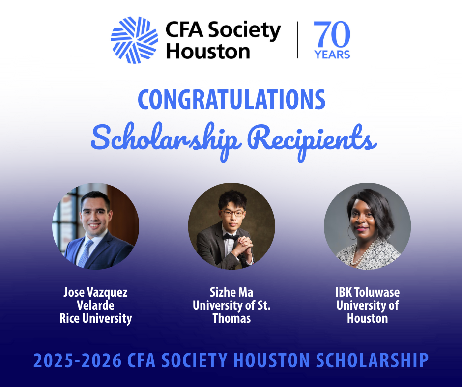 The CFA Society of Houston awards $3,000 annually to three deserving students: one each from Rice University, The University of Houston, and the University of St. Thomas. Each Spring, the CFA Houston Scholarship Committee accepts applications from each of the three universities from graduate business students that have one year remaining in their studies. Applicants are asked to submit a resume and an essay on why they are pursuing the CFA ® designation along with their financial needs. The committee reviews the applications and interviews the prospective applicants while also gathering feedback from the school liaisons that work directly with the committee. From there, one winner from each school is awarded the Society's annual scholarship with the recipients also being invited to a future CFA event where they are formally acknowledged amongst members of the Society.