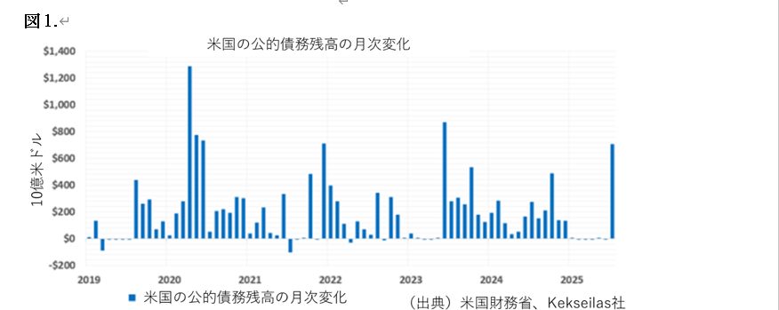国際決済銀行(BIS)は、ステーブルコインへの資金流入が3か月物米国短期国債の利回りを10日以内に2~2.5ベーシスポイント低下させる一方で、資金流出は同じ期間で利回りを6~8ベーシスポイント押し上げると推計しています。BISは「ステーブルコインと安全資産価格(Stablecoins and safe asset prices)」という報告書の中で、米ドルに連動し米国短期国債に裏付けられたステーブルコインが、ますますマネー・マーケット・ファンドに類似しつつあると指摘しています。5兆ドルの債務上限引き上げによって米国短期国債の発行額が増加した後、ステーブルコインは毎週1,000億ドル規模で拡大した4週物米国短期国債の発行額を吸収する役割を担いました。特に2025年7月に米国の公的債務残高が7,000億ドルに急増した際には、米国連邦政府支出の資金供給者としての暗号資産の役割が強調されました(図1)。