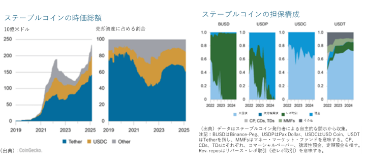 ニューヨーク連邦準備銀行は、ステーブルコイン市場におけるテザーとUSDCの優位性を強調しており、両者はいずれも米国短期国債の大口保有者であると指摘しています(図2)。