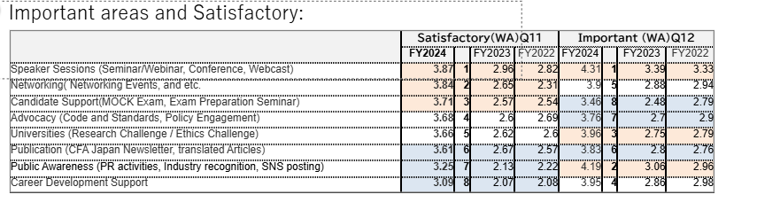 調査結果を受けて: 満足度については、前年度の2.82から3.79と上昇しましたが、会費水準については「高い」と答えた方の比率が前年度の45.54%から50.82%に上昇し過半数を超えました。会員の皆様の会費に対する意識に留意してまいります。活動分野では、重要性は高いにも関わらず満足度は低いと評価された広報活動については、意識して対応してまいります。また、関心のある分野として評価された人工知能・機械学習やプライベートアセットの分野には、留意して活動を進めていこうと考えております。