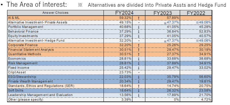関心分野: 関心の高い分野については、人工知能と機械学習が59.32%、オルタナティブ投資-プライベートアセットが49.15%、ポートフォリオ管理が40.68%の順で高く、一方、リーダーシップ管理・評価は13.56%と最も低く、基準・倫理・規制およびソフトスキルはともに18.64%と同順位で、これに続く低い結果となりました。