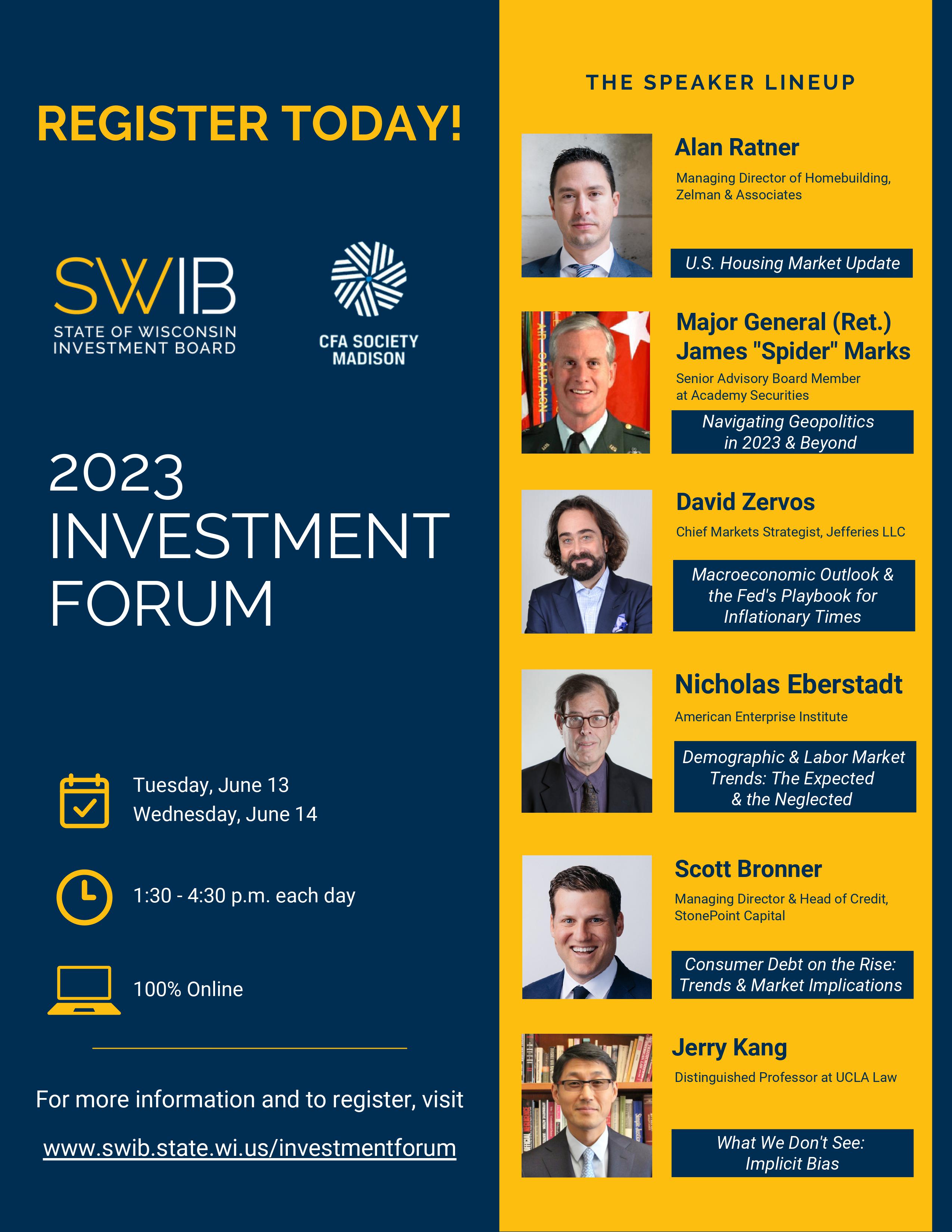 Join us for the 2023 Investment Forum co-sponsored by SWIB and the CFA Society of Madison. This two-day virtual event will feature a lineup of leading industry experts who will provide valuable and insightful information on a wide range of topics.