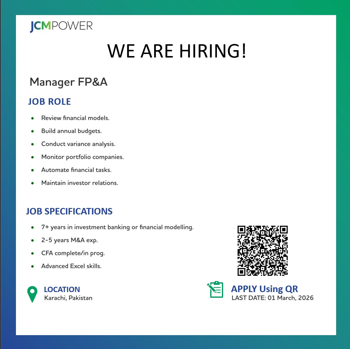 JCM POWER Karachi Job Description