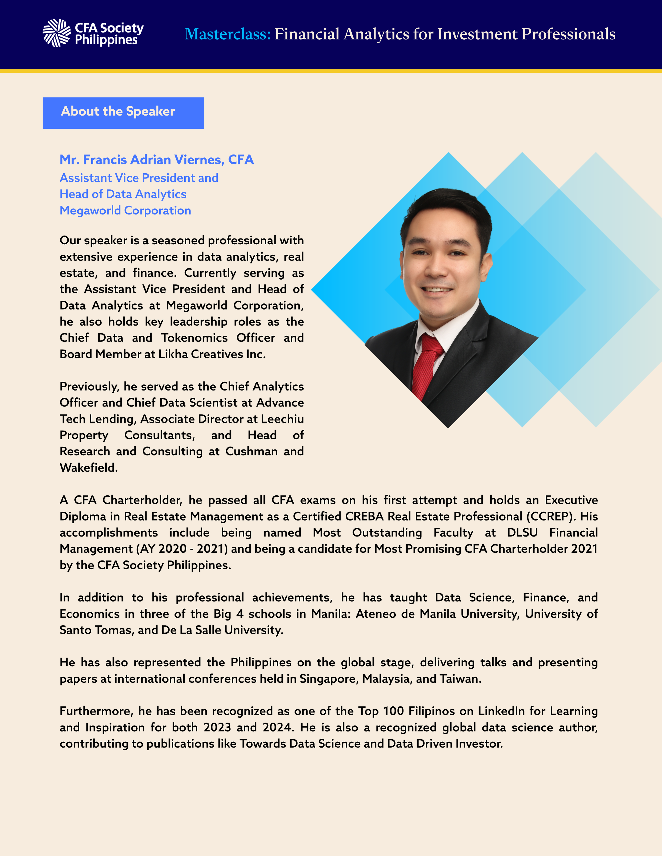 Financial analytics has become a crucial component of modern investment decision-making. With over 5,000 financial analyst positions currently available in the Philippines as of February 2025, including many in Metro Manila, there is a significant demand for professionals skilled in financial data analysis, strategy, and risk assessment. This masterclass is designed to equip investment professionals with advanced analytical techniques, including financial optimization, machine learning, and time series forecasting, to enhance portfolio management, risk analysis, and investment strategy development.