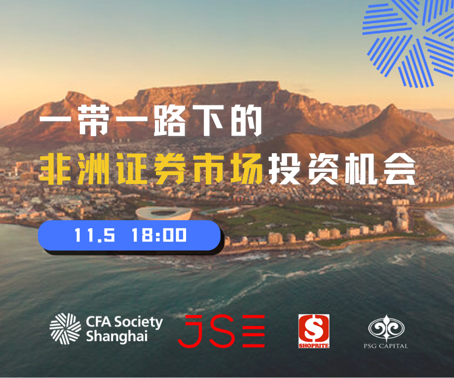 11月5日,CFA上海协会携手约翰内斯堡证券交易所、Shoprite、PSG Capital举办了主题为"一带一路下的非洲证券市场投资机会"的交流活动,作为非洲资本市场首次在中国的推介活动,帮助中国金融投资者了解非洲资本市场情况及投资机会。