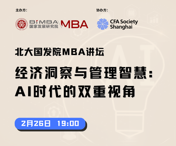 2月26日,由北京大学国家发展研究院MBA中心主办、CFA上海协会协办的「北大国发院MBA讲坛:经济洞察与管理智慧:AI时代的双重视角」成功举行,活动邀请到北京大学国家发展研究院教授,MBA项目学术主任邓子梁教授和统计学者许宪春博士来共同聚焦前沿管理理念与宏观经济趋势。