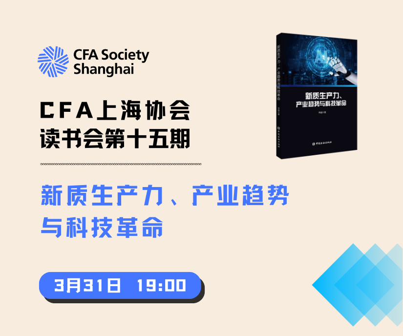 3月31日,CFA上海协会读书会第十五期活动,特邀浙商证券首席经济学家李超先生分享其最新著作《新质生产力、产业趋势与科技革命》,帮助读者全方位理解新质生产力,洞察其在经济发展中的关键作用,为产业布局与投资决策提供战略参考。