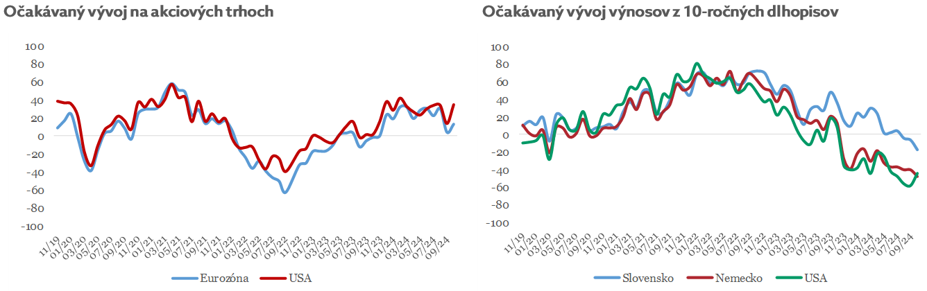 Optimizmus ohľadom vývoja na akciových trhoch obrátil smer a index v eurozóne narástol o 9b na 13b, v prípade USA narástol o 21b na 35b. Indexy očakávaného vývoja výnosov nemeckých a slovenských 10-ročných dlhopisov pokračovali aj v septembri v nastolenom klesajúcom trende, pričom: USA zaznamenalo mierny nárast o 14b. na -44b, pri slovenských 10-ročných dlhopisoch: pokles o 11b na -17b, a nemecké štátne dlhopisy pokles o 8b na -48b.