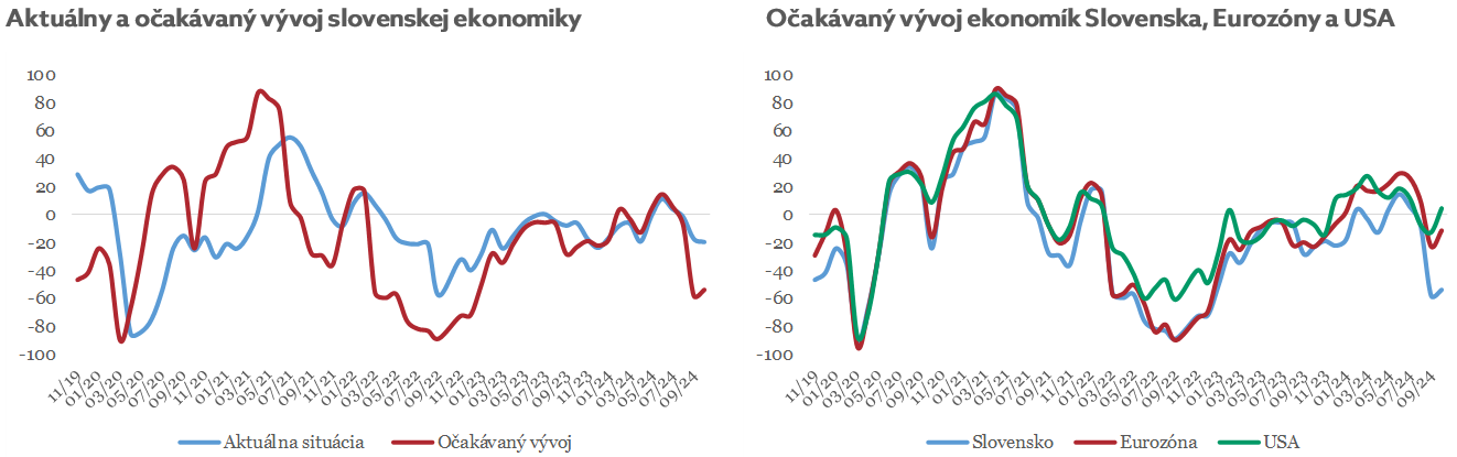 Index ekonomického sentimentu v mesiaci október mierne obrátil v trende a narástol o 4b z -58b na -54b. Ústup inflácie (11%) a pokles úročenia (36%) ako hlavné faktory stojace za očakávaným zrýchlením, ostali nezmenené. Respondenti zvolili tieto faktory spomalenia ako najhlavnejšie: reštriktívna fiškálna politika (49%), pokles politickej stability (36%) a spomalenie zahraničného dopytu (55%). Aktuálny vývoj domácej ekonomiky je vnímaný negatívne, jeho index poklesol o 2b. na -20b, USA narástol o 17b na 4b. Očakávaný vývoj ekonomiky eurozóny tiež narástol o 11b na -12b, zostal tak negatívny.