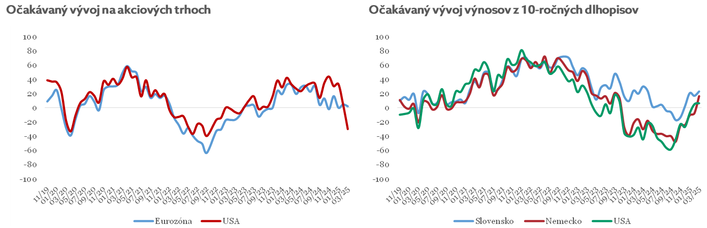 Obavy o dopad ciel na americkú ekonomiku sa pretavili aj do očakávaného vývoja amerických akciových trhov - optimizmus sa premenil na pesimizmus (výrazný pokles o 35b na -30b). Index akciových trhov v eurozóne mierne poklesol o 3b na 2b. Indexy očakávaného vývoja výnosov amerických, nemeckých a slovenských 10-ročných dlhopisov pokračovali v raste aj tento mesiac, pričom pri nemeckých 10-ročných dlhopisoch narástol o 24b na 16b, pri USA štátnych dlhopisoch o 1b na 6b, pri slovenských o 6b na 23b.