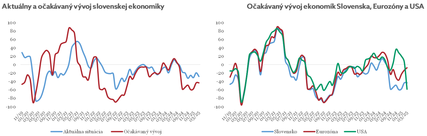 Index ekonomického sentimentu v mesiaci marec ostal bez zmeny a to na -43b. Pokles úročenia (24%) ostáva ako hlavný faktor stojaci za očakávaným zrýchlením. Naďalej však medzi respondentami prevažuje negatívny sentiment. Tieto faktory spomalenia sú najhlavnejšie: eskalácia geopolitického napätia (48%), pokles politickej stability (44%) a spomalenie zahraničného dopytu (57%). Aktuálny vývoj domácej ekonomiky je vnímaný negatívne, jeho index mierne poklesol o 8b na -28b. Očakávania ohľadom vývoja americkej ekonomiky klesajú tretí mesiac v rade kvôli neistote ohľadom colnej politiky a obavám z obchodnej vojny. Tento mesiac očakávania klesli oveľa väčším tempom, a to na aktuálnych -58b, čo predstavuje výrazný pokles o 65b. V prípade eurozóny očakávaný vývoj ekonomiky naopak mierne narástol o 5b na -8b.