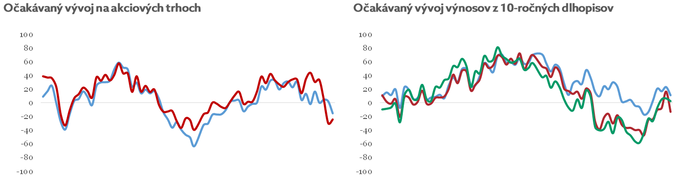 Po odhalení colnej politiky neistota mierne upadla a index očakávaného vývoja amerických akciových trhov mierne narástol o 6b na -24b. Index akciových trhov v eurozóne naopak výrazne poklesol o 18b na -16b. Indexy očakávaného vývoja výnosov amerických, nemeckých a slovenských 10-ročných dlhopisov tento mesiac mierne poklesli, pri nemeckých 10-ročných dlhopisoch výrazne o 30b na -13b, pri USA štátnych dlhopisoch o 4b na 2b, pri slovenských o 12b na 11b.