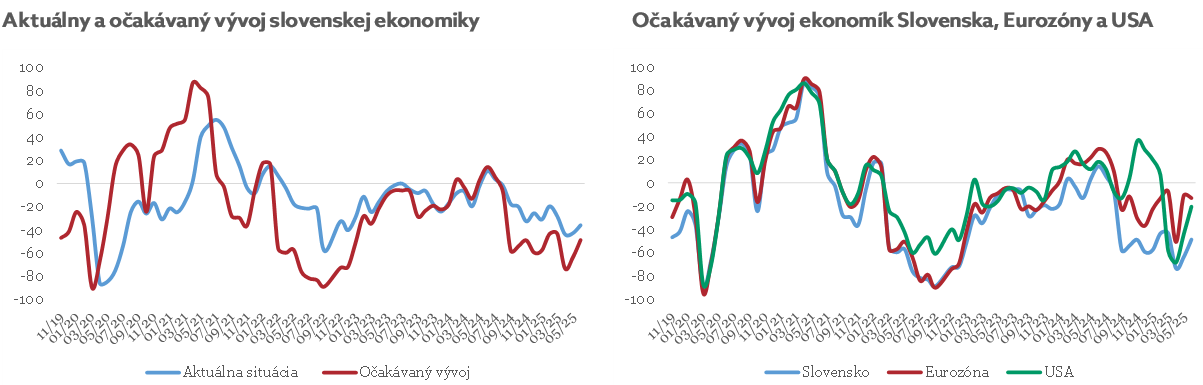 Index ekonomického sentimentu v mesiaci jún pokračoval v raste, a to o 15b na -49b. Pokles úročenia (24%) ostáva ako hlavný faktor stojaci za očakávaným zrýchlením. Naďalej však medzi respondentami prevažuje negatívny sentiment. Tieto faktory spomalenia sú najhlavnejšie: eskalácia geopolitického napätia (57%), pokles politickej stability (64%) a spomalenie zahraničného dopytu (85%). Aktuálny vývoj domácej ekonomiky ostal nezmenený a je vnímaný negatívne, jeho index mierne narástol o 7b na -36b. Očakávania ohľadom vývoja americkej ekonomiky mierne vzrástli, index narástol o 23b na -21b. V prípade eurozóny očakávaný vývoj ekonomiky mierne poklesol o 2b na -13b.