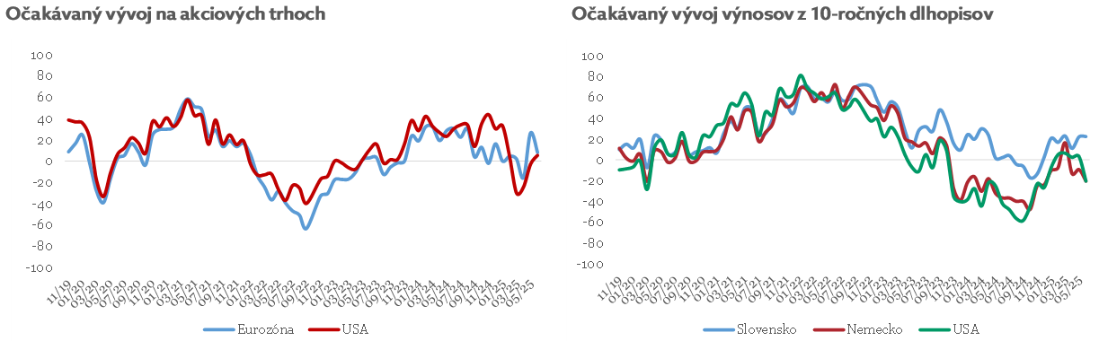 Respondenti aj tento mesiac vylepšili svoje očakávania vývoja na americkom akciovom trhu, index sa zvýšil o 8b a preklopil sa do pozitívneho pásma na úroveň 5b. V prípade eurozóny sledujeme korekciu z minulomesačného prudkého nárastu, konkrétne pokles o 18b. Naďalej však zostávame v pásme rastu na celkovej úrovni 8b. Indexy očakávaného vývoja výnosov amerických a nemeckých 10-ročných dlhopisov tento mesiac mierne poklesli, pri nemeckých 10-ročných dlhopisoch o 12b na -21b, pri USA štátnych dlhopisoch o 24b na -21b, pri slovenských dlhopisoch bez zmeny.