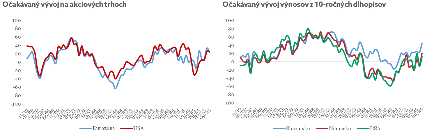 Pozitívny sentiment na akciových trhoch mierne poklesol, v prípade USA o 2b na 24b a v prípade eurozóny o 10b na 23b. Na dlhopisových trhov pretrváva volatilita, respondenti opäť očakávajú nárast výnosov v USA (index narástol o 23b na 12b), v Nemecku (index narástol o 29b na 21b) aj na Slovensku (index narástol o 22b na 44b).
