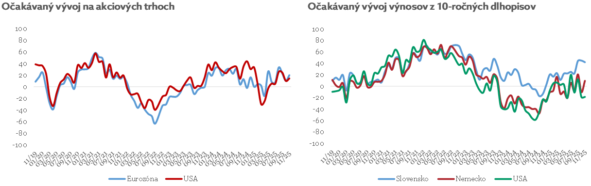 Pozitívny sentiment na akciových trhoch narástol, v prípade USA o 4b na 14b a v prípade eurozóny o 10b na 20b. Na dlhopisových trhov pretrváva volatilita, respondenti očakávajú pokles amerických výnosov (index ostal bez zmeny na -19b), nárast nemeckých (index narástol o 20b na 9b) aj slovenských výnosov (index mierne poklesol o 3b na 42b).
