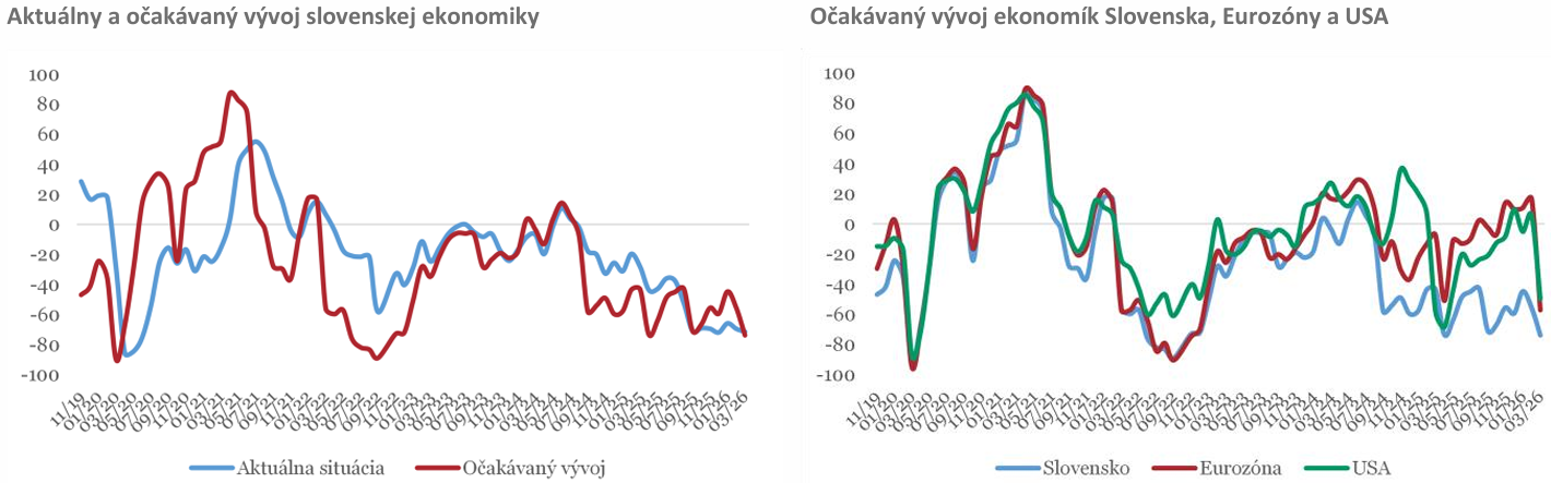Index ekonomického sentimentu po februárovom poklese pokračoval v prepade aj v marci, konkrétne o 18b na úroveň -74b. Vojnový konflikt na Blízkom Východe výrazne zasiahol aj ekonomický sentiment. Medzi faktormi stojacimi za očakávaným spomalením ekonomiky dominovali eskalácia geopolitického napätia, ktorú značilo 95% respondentov, a spomalenie zahraničného dopytu (80%). Zvýšenie inflácie (70%) a s tým súvisiaci rast úročenia (38%) sa s vojnovým konfliktom opäť dostali do popredia. Aktuálny vývoj domácej ekonomiky je vnímaný naďalej negatívne, index poklesol o 2b na -71b. Respondenti prudko korigovali svoje očakávania ohľadom vývoja americkej či európskej ekonomiky smerom nadol, a to o 56b na -50b, resp. o 74b na -57b.
