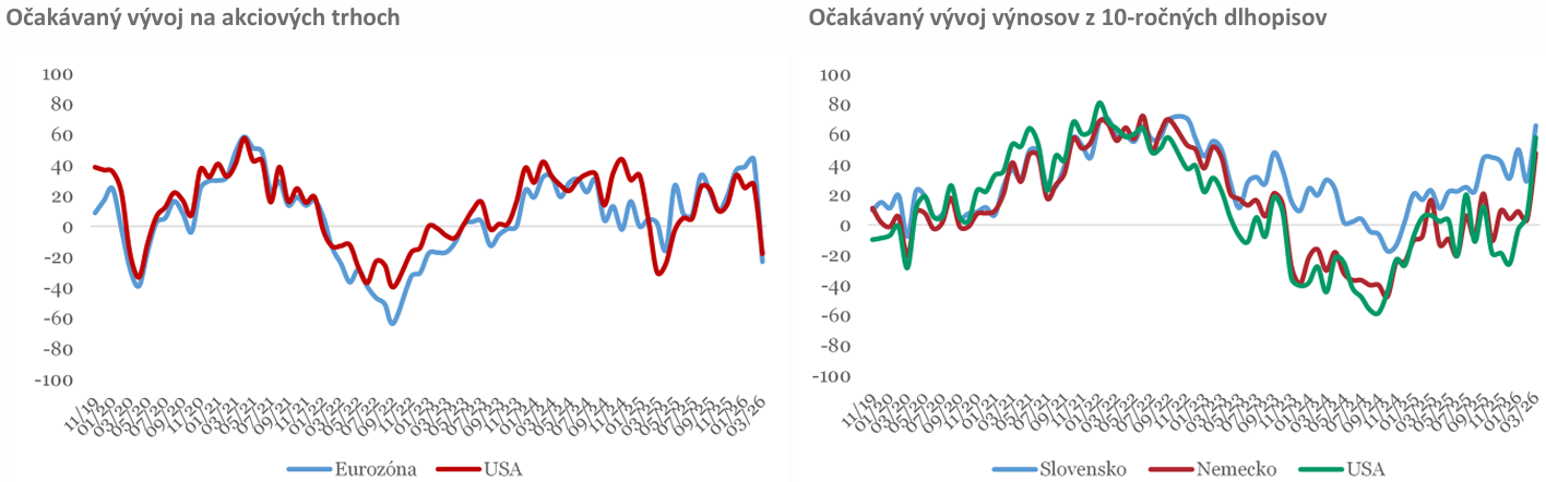 Vojna zasiahla aj sentiment na finančných trhoch. Očakávania ohľadom vývoja na akciových trhoch sa prepadli najvýraznejšie v sledovanom období od konca roka 2019, v USA o 45b na -18b a v prípade eurozóny o 67b na -23b. Očakávania rastu úročenia v dôsledku vojnového konfliktu sa odzrkadlili aj na dlhopisových trhoch, index očakávaných výnosov dlhopisov v USA vystrelil nahor o 51b na 58b, v Nemecku o 44b na 47b, na Slovensku o 37b na 66b.