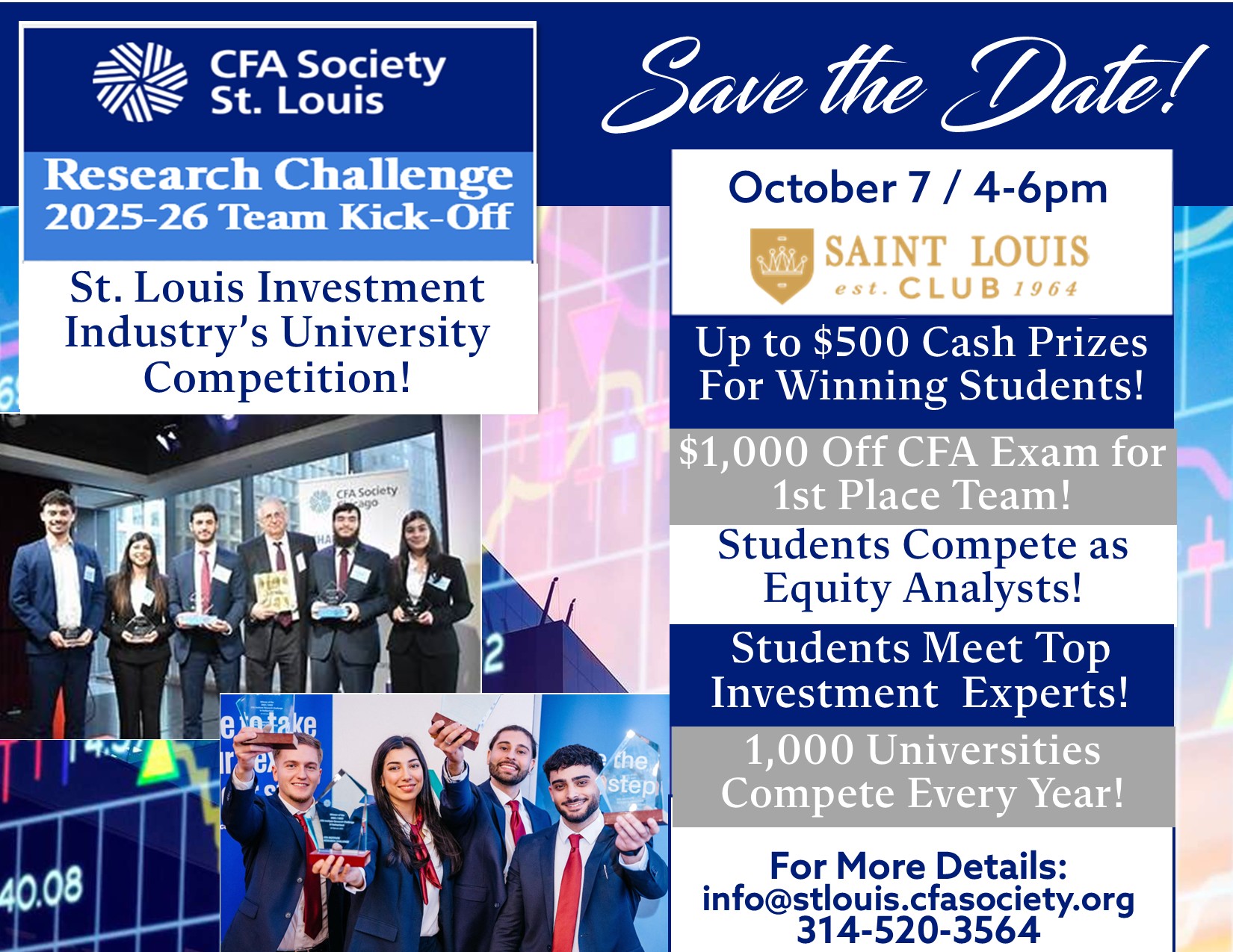 Members of our society, along with a faculty advisor and an industry mentor, work with teams of students to value a stock, write a research report, and present their recommendations. Teams then compete with peers from other schools at local-level competitions organized and judged by CFA Society members and volunteers. The winning university team(s) from each local competition then advances to see who will become the sub-regional, regional, and global champions.