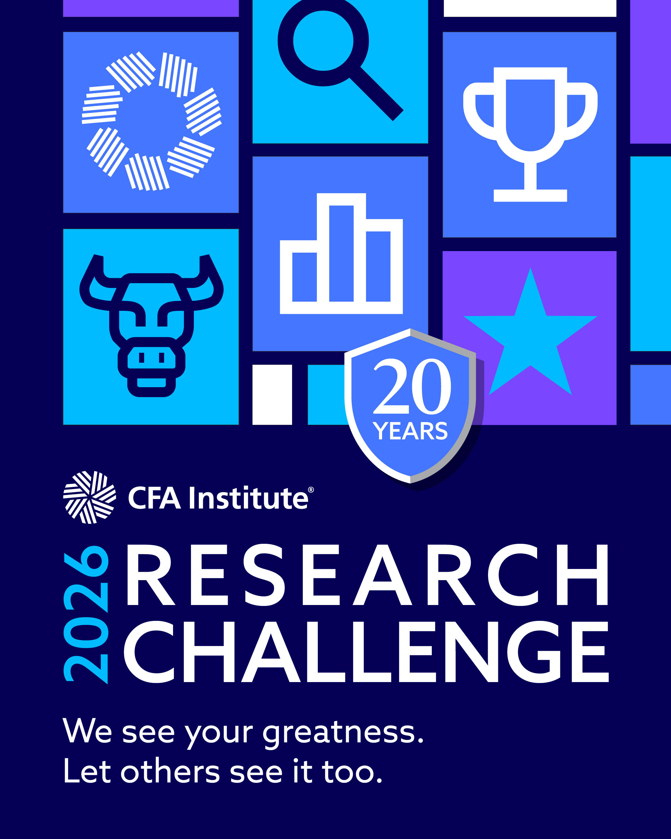 The CFA Institute Research Challenge is an annual global competition that connects university students with investment professionals from within the CFA Society® network. The competition provides students with hands-on mentoring and intensive training in financial analysis and ethics and tests participants' analytical, valuation, reporting writing, and presentation skills.
